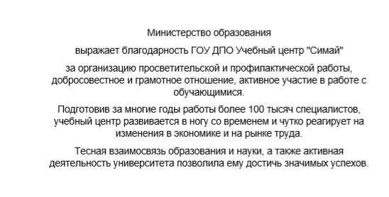 Министерство образования выражает благодарность ГОУ ДПО Учебный центр "Симай" за организацию просветительской и профилактической работы, добросовестное и грамотное отношение, активное участие в работе с обучающимися. Подготовив за многие годы работы более 100 тысяч специалистов, учебный центр развивается в ногу со временем и чутко реагирует на изменения в экономике и на рынке труда. Тесная взаимосвязь образования и науки, а также активная деятельность университета позволила ему достичь значимых успехов.